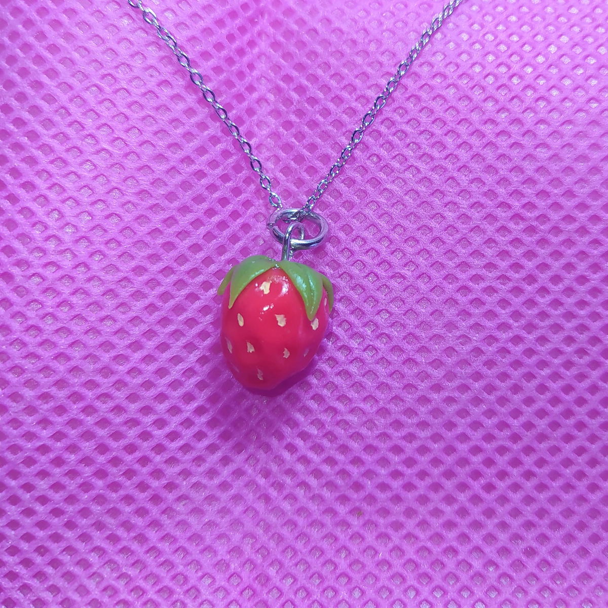 Delicioso dije de frutilla hecho a mano. Incluye cadenita de acero quirúrgico.
